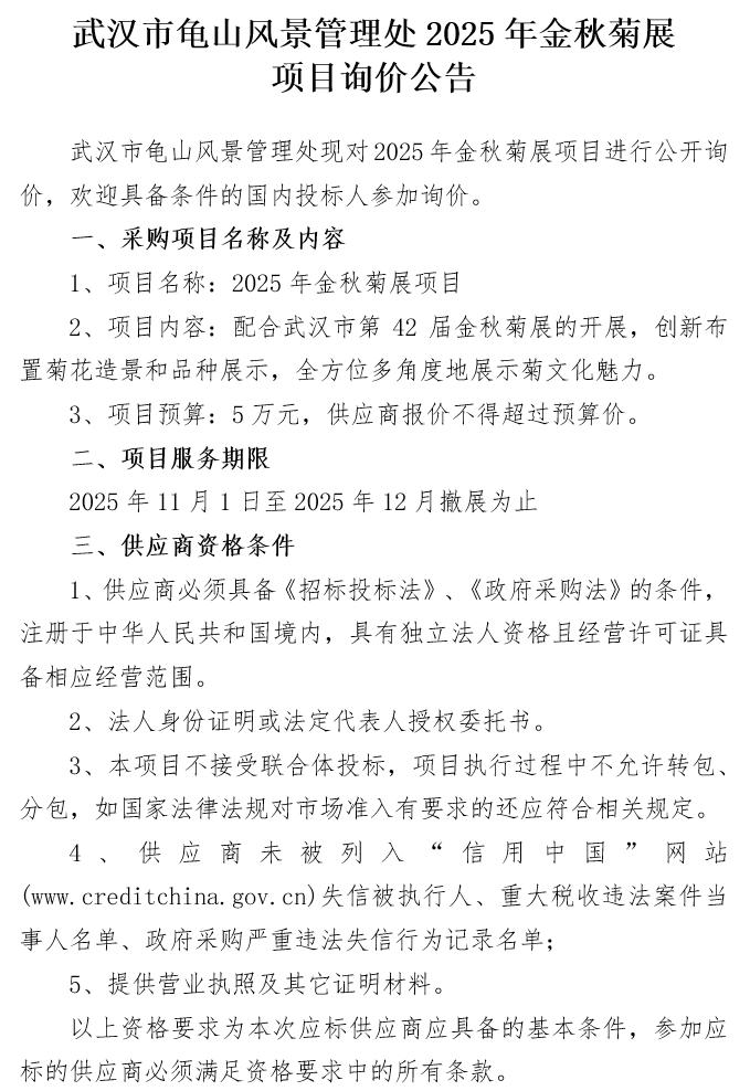 武汉市龟山风景管理处2025年金秋菊展项目询价公告