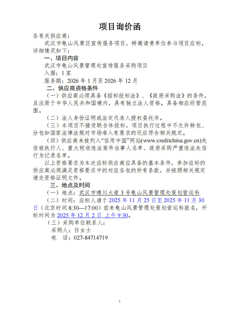 武汉市龟山风景管理处宣传服务采购项目询价函