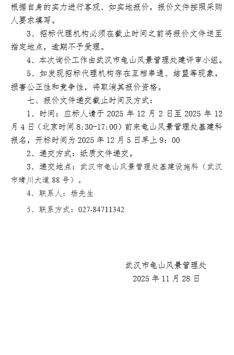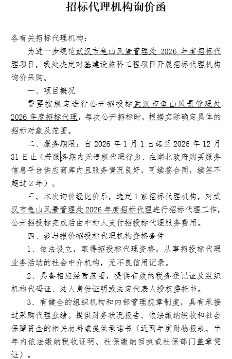 武汉市龟山风景管理处2026年度招标代理项目询价函