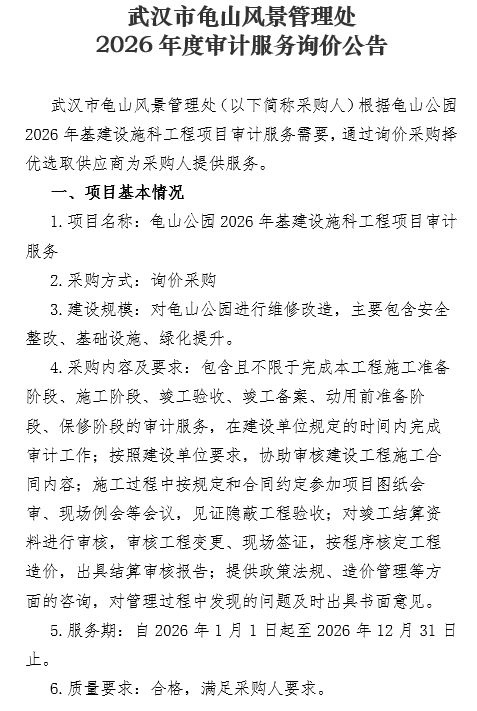 武汉市龟山风景管理处2026年度审计服务询价公告