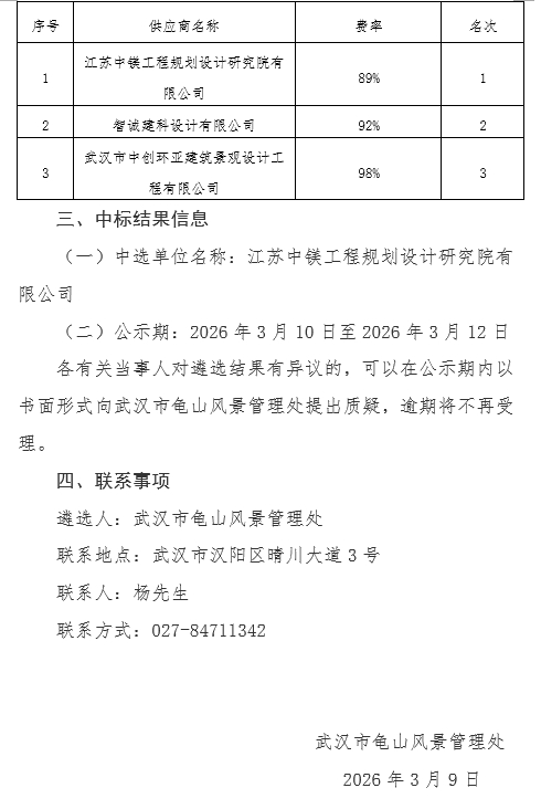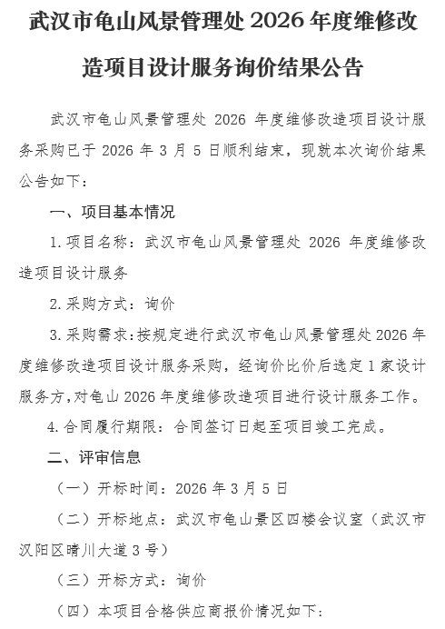 武汉市龟山风景管理处2026年度维修改造项目设计服务询价结果公告