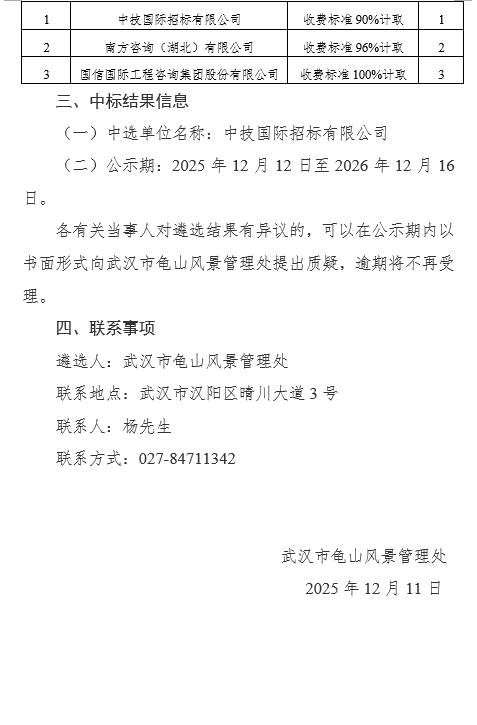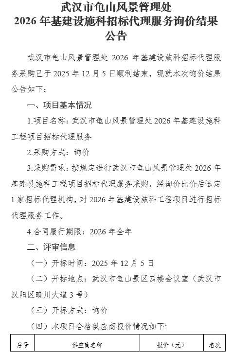 武汉市龟山风景管理处2026年基建设施科招标代理服务询价结果公告