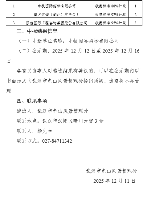 武汉市龟山风景管理处2026年基建设施科工程项目造价咨询服务询价结果公告