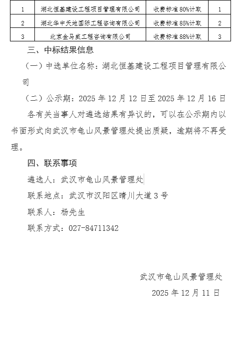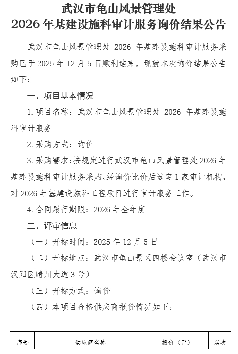 武汉市龟山风景管理处2026年基建设施科审计服务询价结果公告