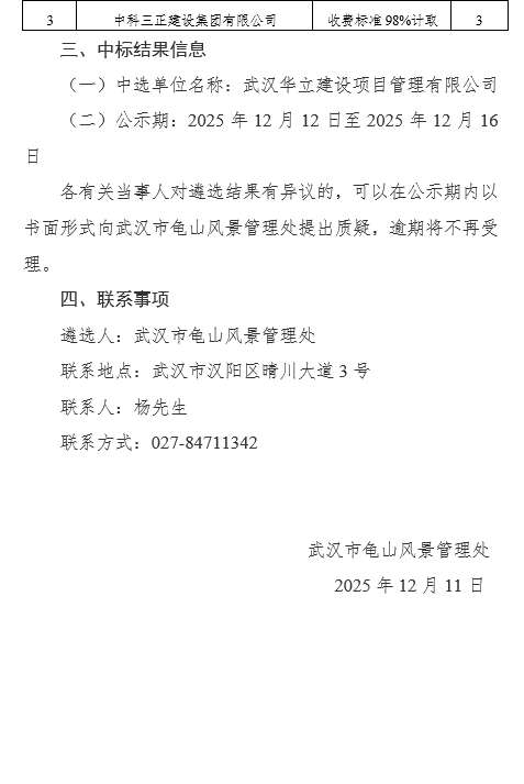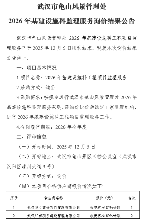 武汉市龟山风景管理处2026年基建设施科监理服务询价结果公告
