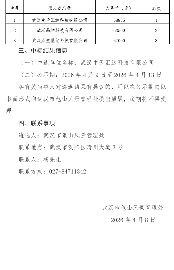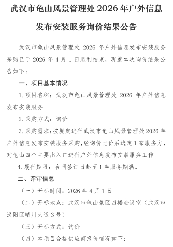 武汉市龟山风景管理处2026年户外信息发布安装服务询价结果公告